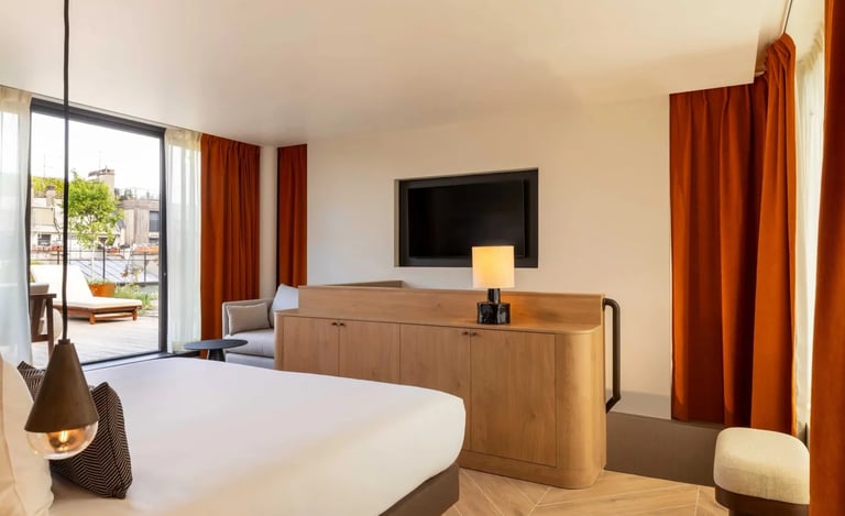 Designed as cocoons to recharge your batteries just a stone's throw from the hustle and bustle of the city, with their curves and Parisian touches, the 37 rooms and suites of the Château des Fleurs invite you to put down your suitcases, for a few nights or for an extended stay in the heart of the French capital.
